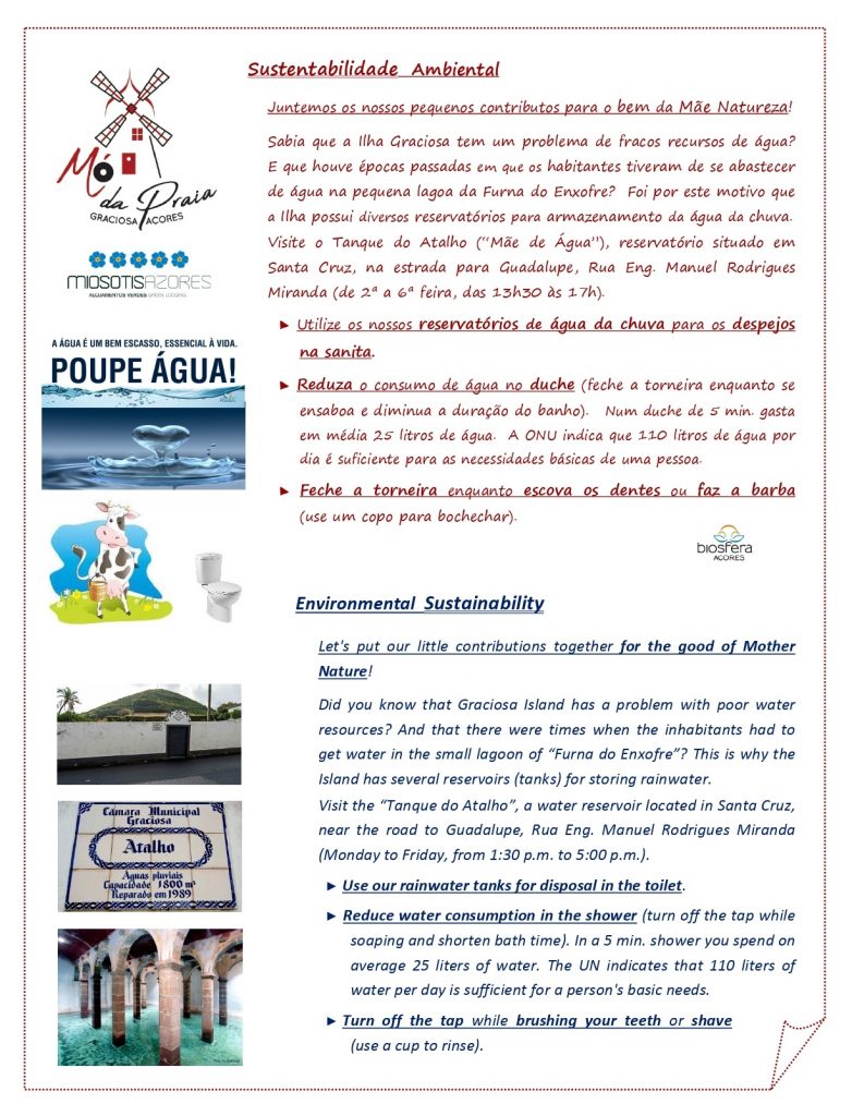 2. Provide an environment guide to our guests to motivate them to have good environmental practices, including: meeting goal 1 and saving water (reporting on Graciosa water scarcity over time); separate and recycle using the containers we provide; replace the use of plastic bags with cloth bags that we offer. (SDG6, SDG12)